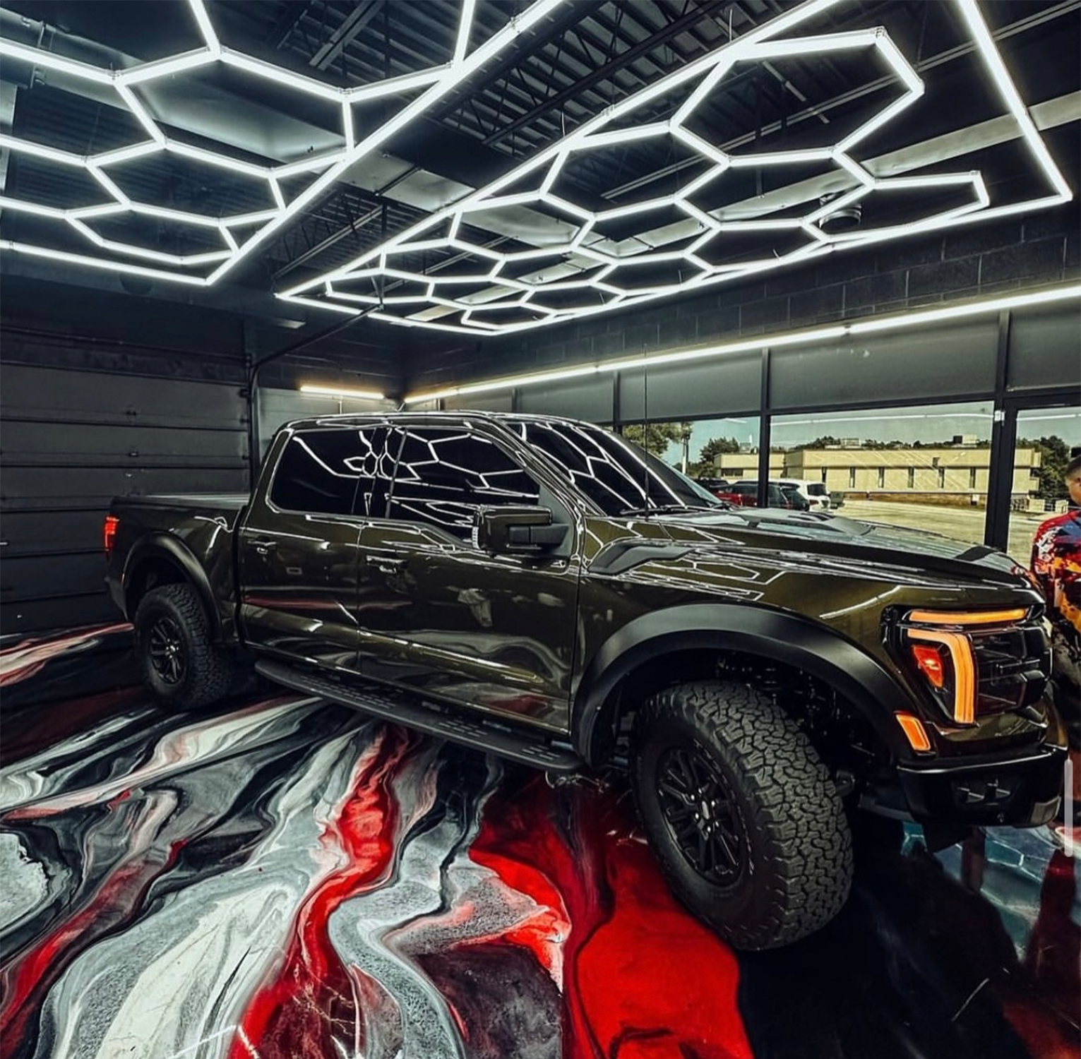 Transform your garage into a one of a kind automotive sanctuary. Custom 3 colour Metallic design + Hexagonal performance lighting.